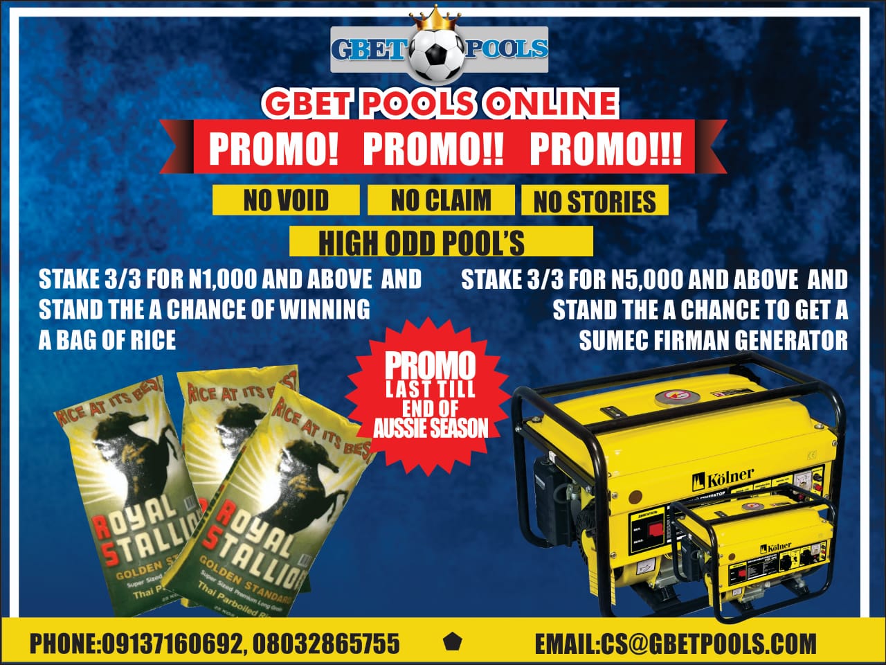 ALL MATCHES END ON SUNDAY. STAKE ON GBETPOOLS.COM TO WITHDRAW YOUR WINNING AFTER THE RESULTS